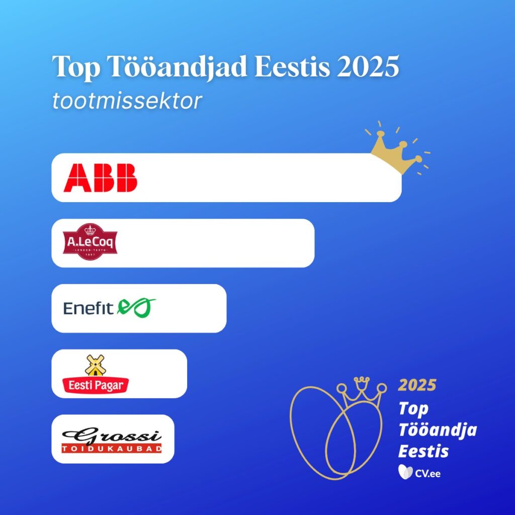 Top Tööandja uuringus pälvis tootmissektori esikoha ABB AS, kinnitades oma tugevat positsiooni tööandjana juba mitmendat aastat järjest. Uuring kajastab töövõtjate eelistusi ning tööandjate mainet Eesti tööturul.